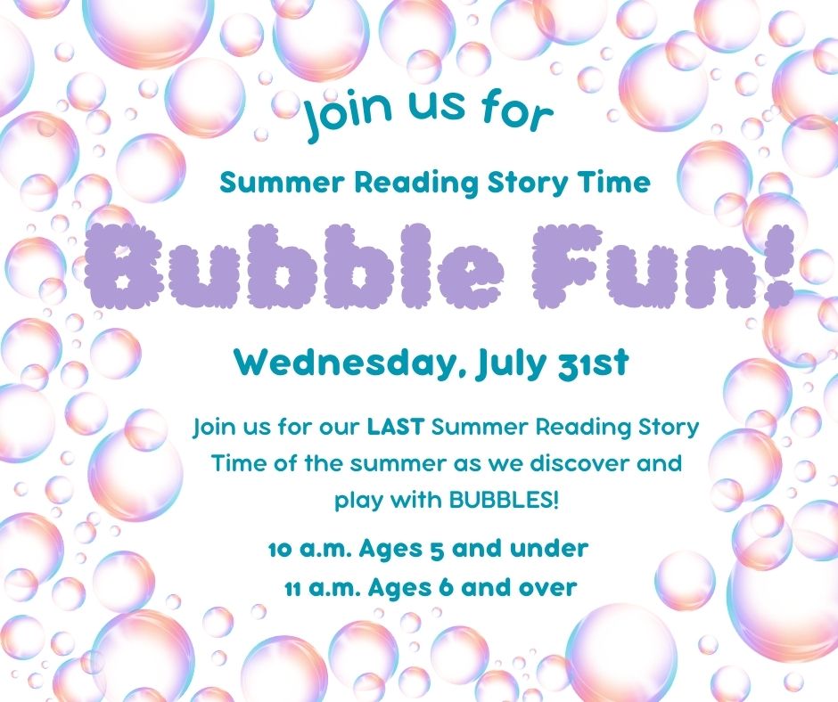 Don’t forget tomorrow is Summer Reading Story Time! Ages 5 and under 10-10:45 a.m. Ages 6 and over 11-11:45 a.m.