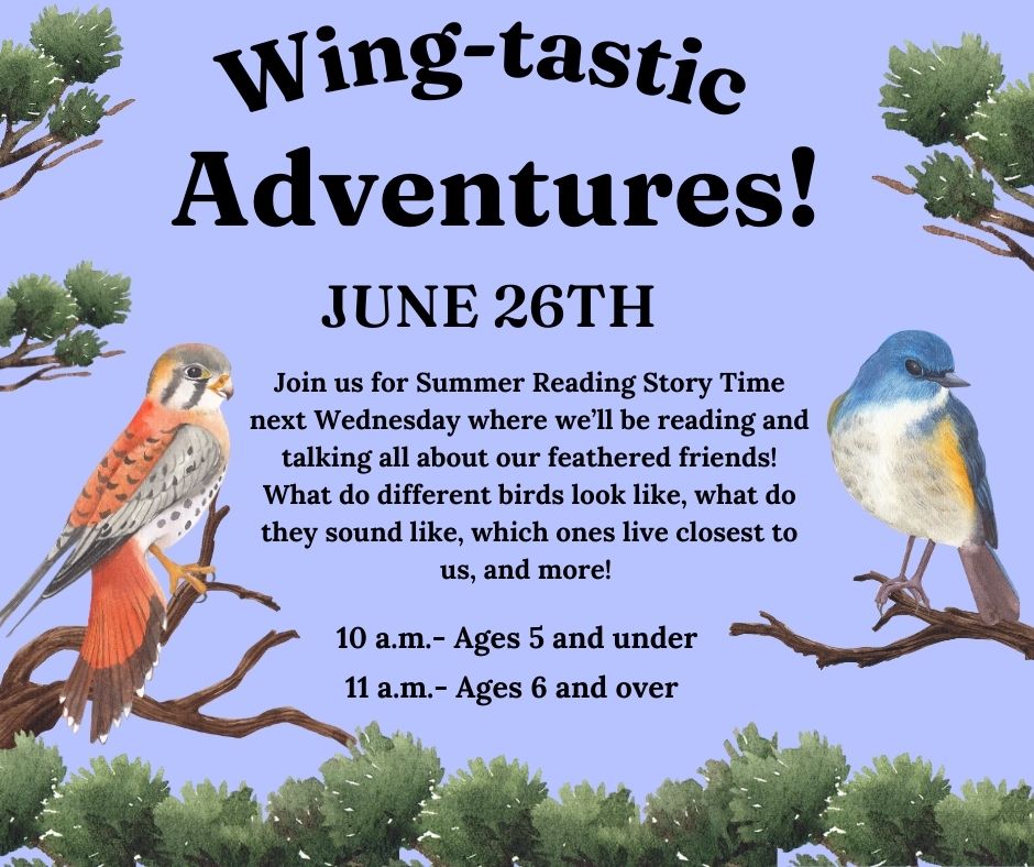 Join us next Wednesday, June 26th, for Summer Reading Story Time as we discover all the fun things about…BIRDS! We’ll read some books and do a fun activity or two all about our favorite feathered friends!