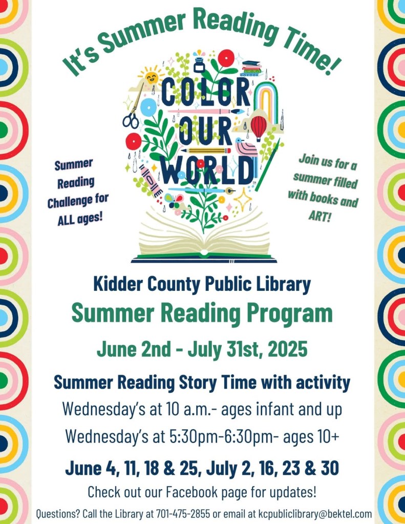Thank you to the Kidder County community for supporting our Summer Reading program and we look forward to seeing you this Wednesday!